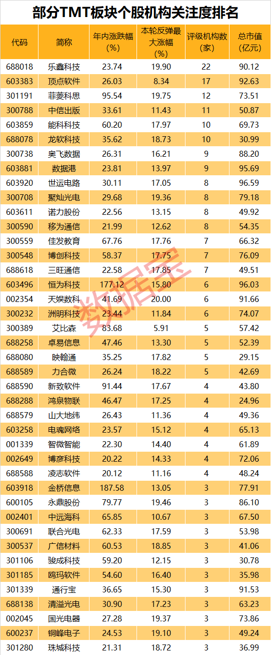 据此,数据宝统计显示,近期股价滞涨、目前市值较小且机构关注度较高的前期强势龙头股,合计共有40股。从年内表现来看,金桥信息、恒为科技两股均涨超170%,菲菱科思、新致软件、艾比森、永鼎股份、佳发教育等均涨超60%。