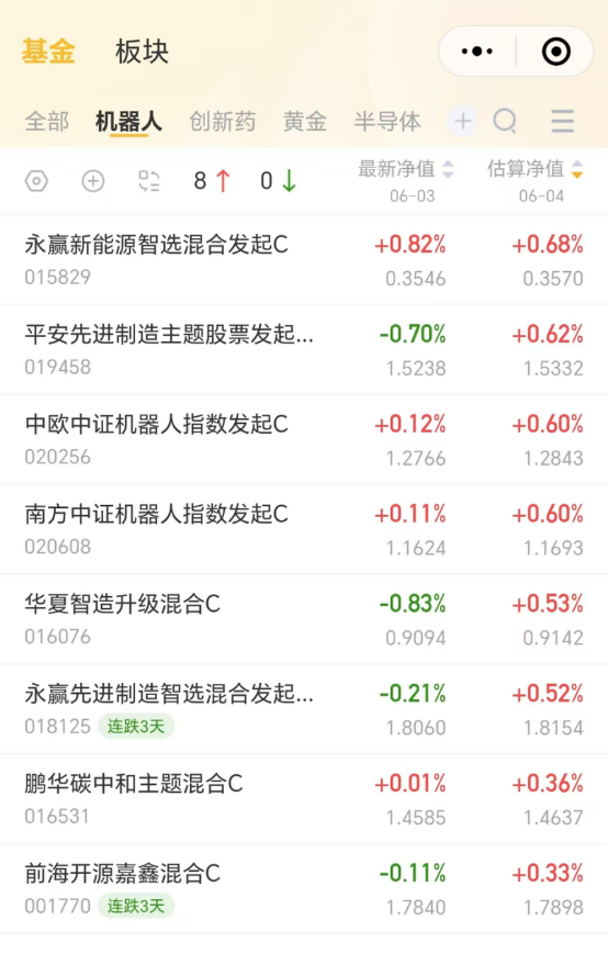 随着政策的利好,人形机器人作为高弹性板块将显著受益。聚焦机器人产业链+新能车智能化的$永赢新能源智选混合发起C$ (015829)迈入配置区间,昨日逆势上涨0.82%,今日再度预估上涨,轻松实现二连阳,而且连续2天涨幅都是同类第一!