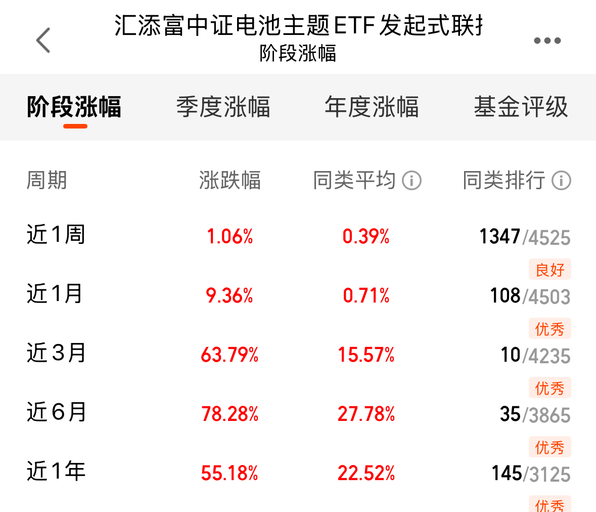 不管是从储能爆发还是从已披露的财报看,电池板块现在供需持续改善,行业拐点明显。现在的电池就是前期的CPO跟芯片,不想踏空要想吃大肉就要早点进,我今天也顺势加了一份汇添富中证电池主题ETF联接C,成分股覆盖储能+固态电池双主线,储能龙头阳光电源、新能源四大天王均在其前十之列!汇添富中证电池也是同类中综合费率的管理费+托管费+销售服务费仅为0.45%/年,省到的就是多赚的,都会体现在业绩上。