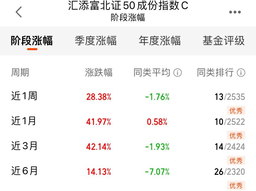而且$汇添富北证50成份指数C$ 近1个月已经涨了41.97%啦,跑赢同类平均40多个点,多个阶段业绩排名都是优秀,如果风险偏好比较高、又想博弈这11%的反弹空间,这只7天0费率的短线比较好操作。