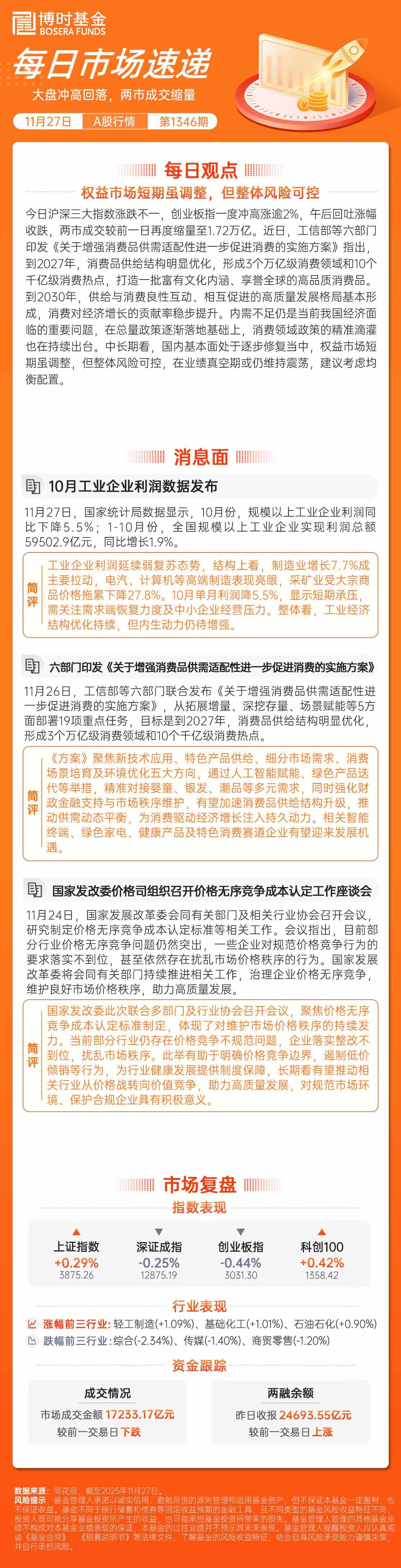 【博时市场点评11月27日】大盘冲高回落,两市成交缩量