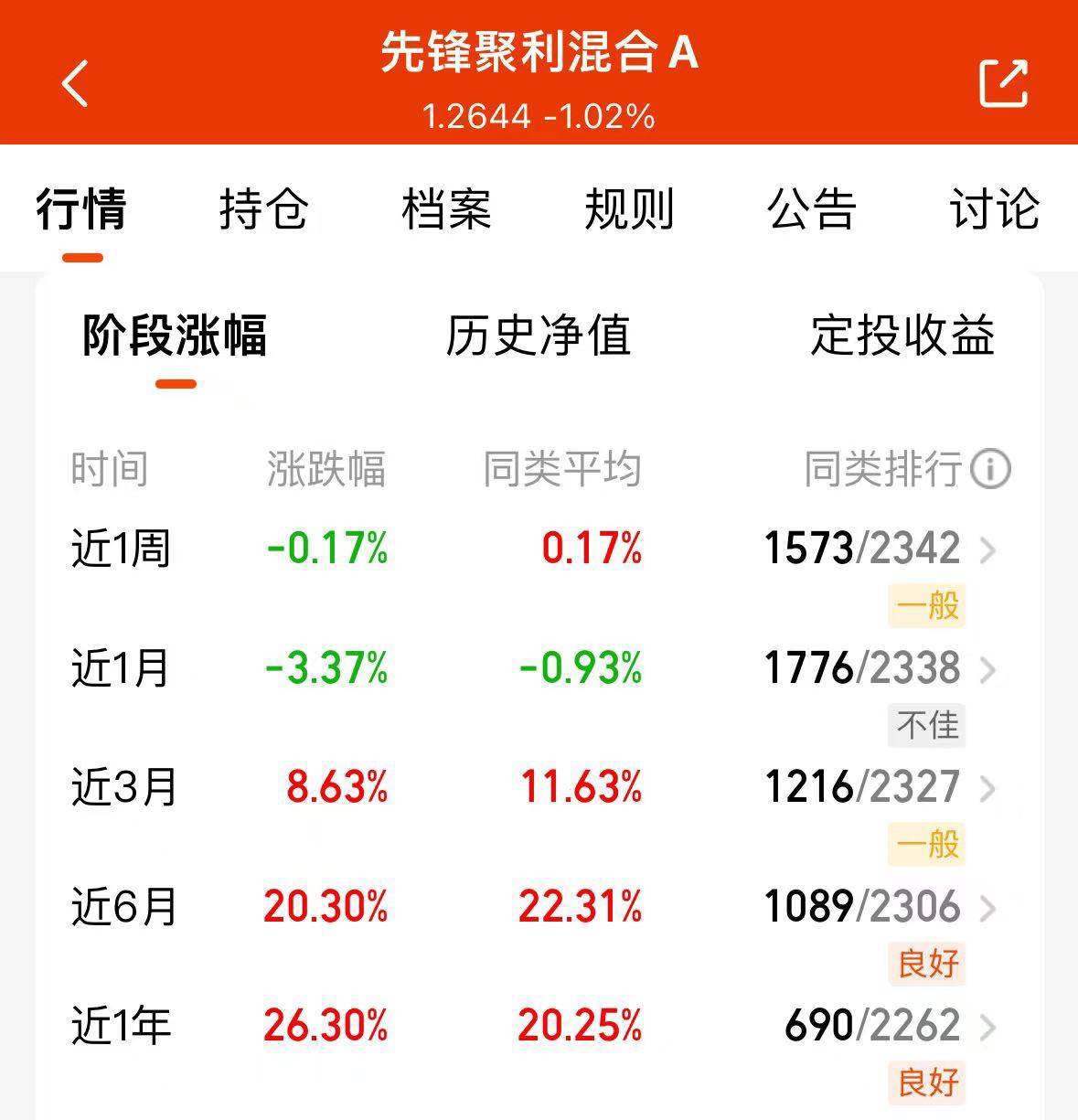 先锋聚利混合A略微回调,今天正好有上车点的够犀利,近1年26.30%稳稳向上,近