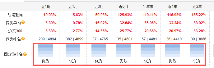 以$易方达信息产业混合C(OTCFUND|019018)$为例,近1年收益率是116.92%,同类平均只有33.34%,沪深300是20.97%,超额收益率快3倍多了,四分位排名无论是短期近1周还是长期近2年,全部都是优秀。