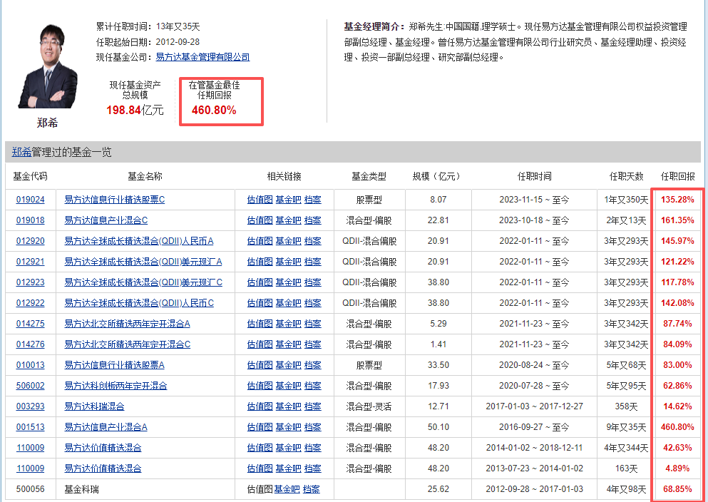2、也比较看重基金经理郑希的能力,你仔细剖析下这哥们的在管产品,任职回报率是非常的香。在管基金的最佳任职回报是460.8%,其它的基本都在50%—140%之间的区间,这种收益率,还是非常少见的。