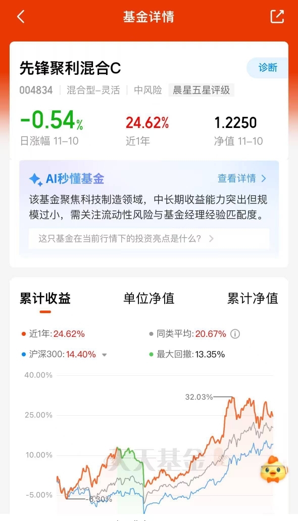 利率下行利好全被先锋聚利混合C接住,近三个月8.89%收益,略微回调,今天正好有上车点涨得痛快