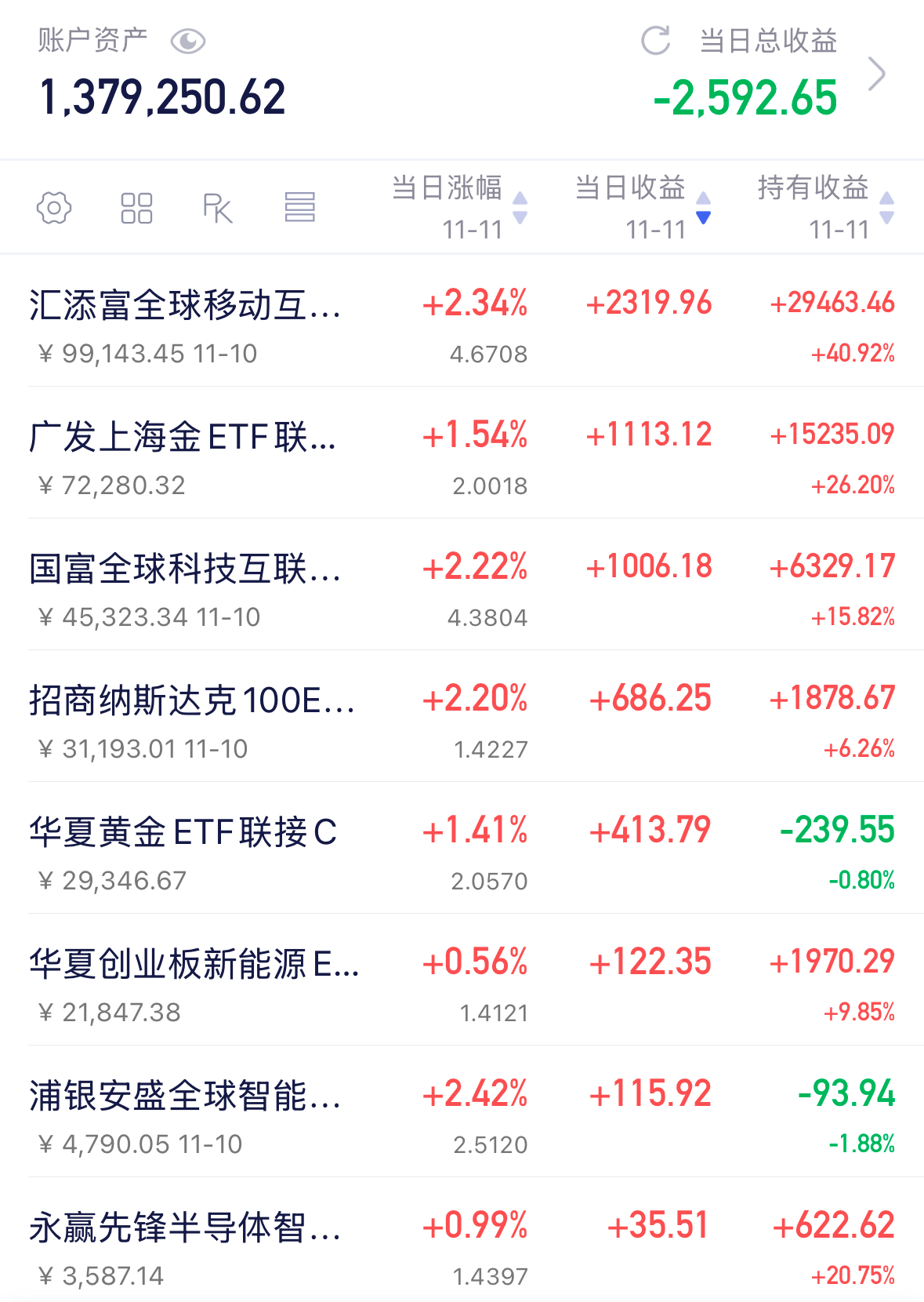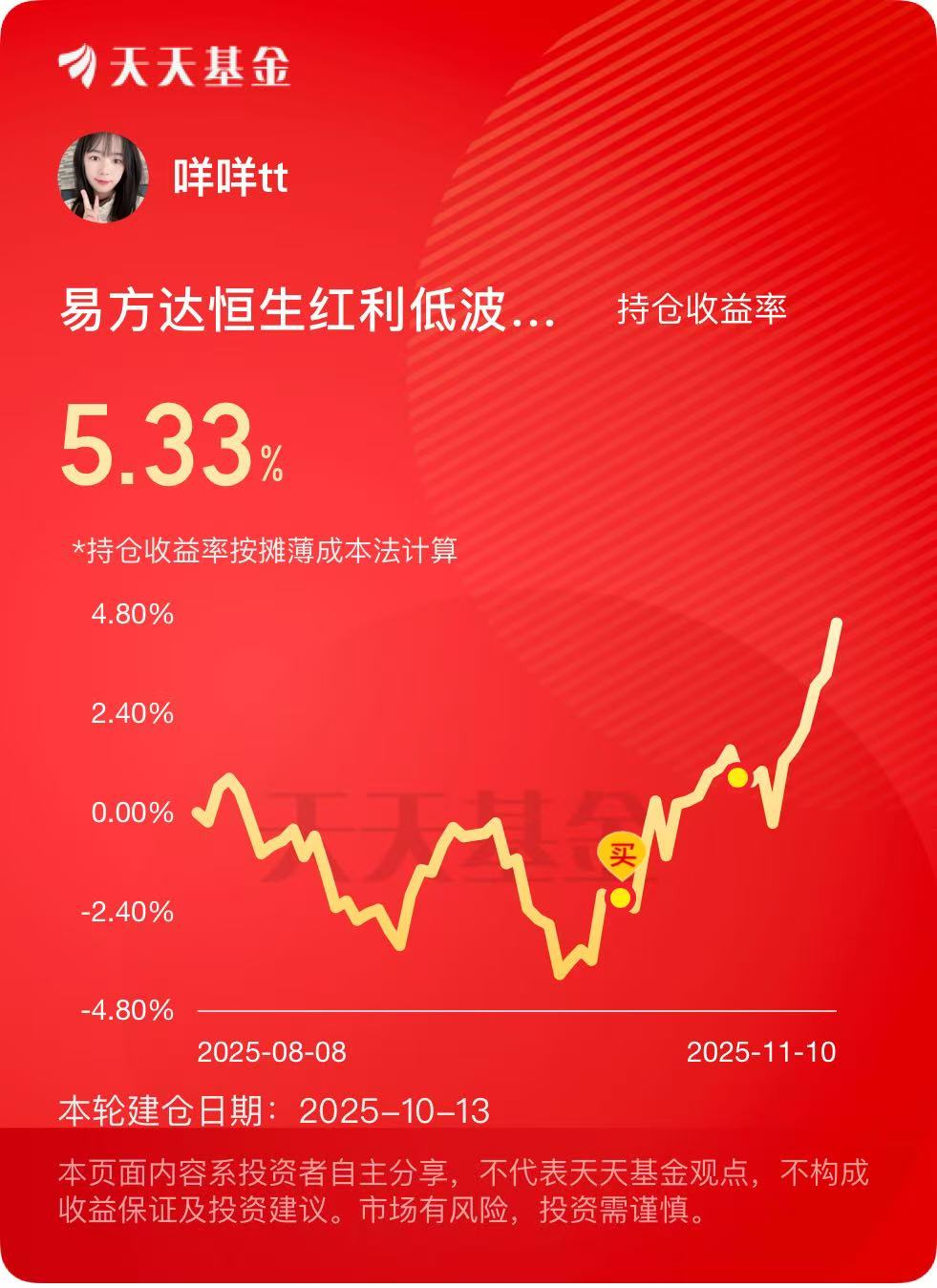 临近年底,市场情绪趋向谨慎,高估值成长赛道资金回流低风险资产,恒生红利低波的高股息、低估值特征恰好契合资金求稳需求。其成分股覆盖的金融、公用事业、消费等行业,业绩确定性强,在市场震荡时也能依靠扎实的盈利能力兑现分红,因而也能扛住市场波动,这也是我增配易方达恒生红利低波的主要原因,给组合增厚安全垫。我买的易方达恒生红利低波ETF联接C还设置了季季分红,持有更省心,趁今天红利板块震荡整理我赶紧再加5000元。