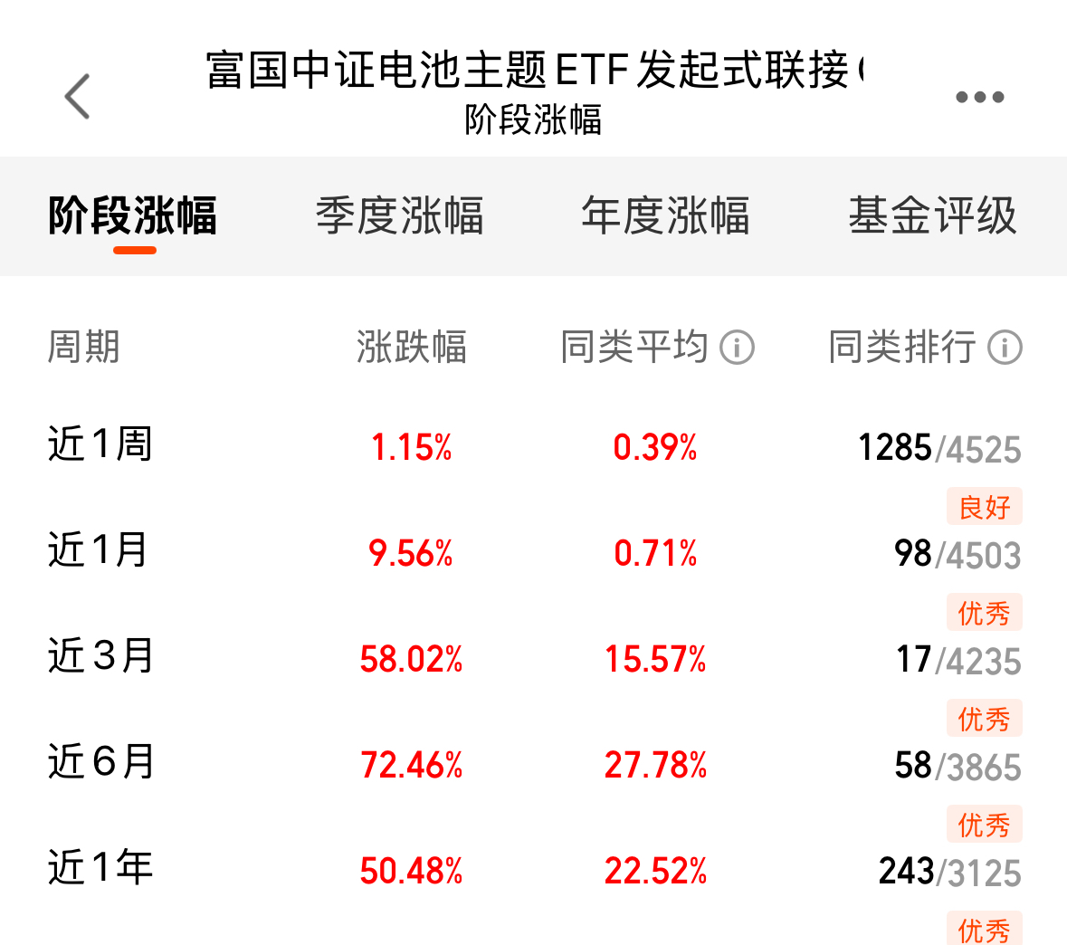 有政策、有需求、具备超跌反弹动力,电池板块接下来的行情我依旧看好,富国中证电池主题ETF发起式联接C龙头集中爆发力强,近3月涨幅58.02%,我今天也顺势上车一份。
