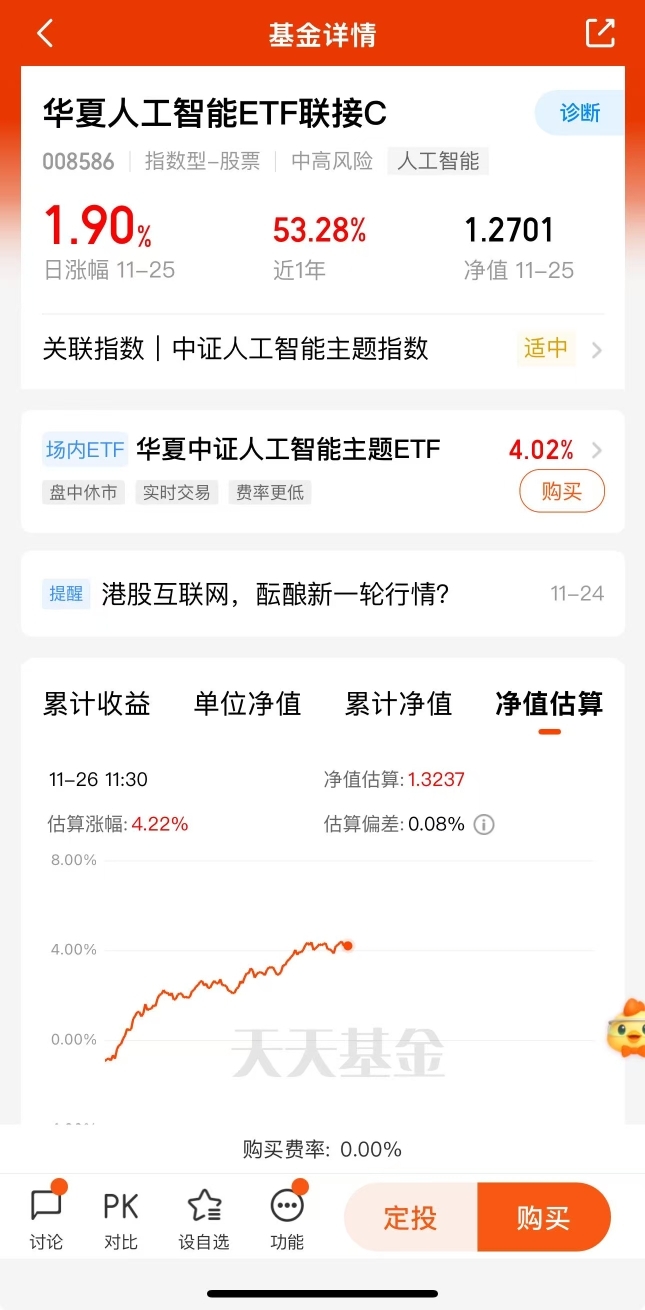 始终认为人工智能是最有前景的板块,今天上涨超4%,昨天收益1.90%,$华夏人工智能ETF联接C$近6月收益超50%,表现也相较同类更好,是中长期配置的宝藏基金
