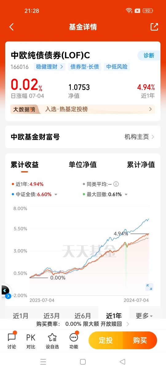 成就一个好的债基,需要两个因素,一方面债基表现稳定,纯债无疑就是这样的债基,稳健上行,收益不错。另一方面,恰是一个震荡的市场,给了债基良好的表现机会,现在就是这个行情,相较于权益类的震荡,持有纯债反而变成最大的惊喜。安全,稳健,就是纯债的特点,我安心持有,规避风险。@中欧基金