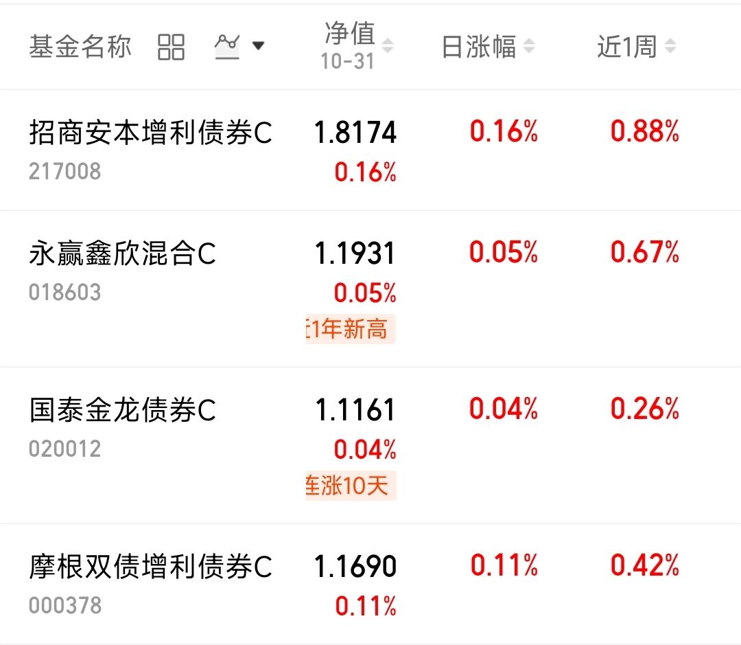 今日本以为开门红,但是表现不是那么理想,我就打算选择偏债基金,将上周的偏债基金对比,$招商安本增利债券C(OTCFUND|217008)$、$永赢鑫欣混合C(OTCFUND|018603)$、$国泰金龙债券C(OTCFUND|020012)$和$摩根双债增利债券C(OTCFUND|000378)$上周都是上涨,安本手16个蛋,所以我会选择招商安本和摩根双债!