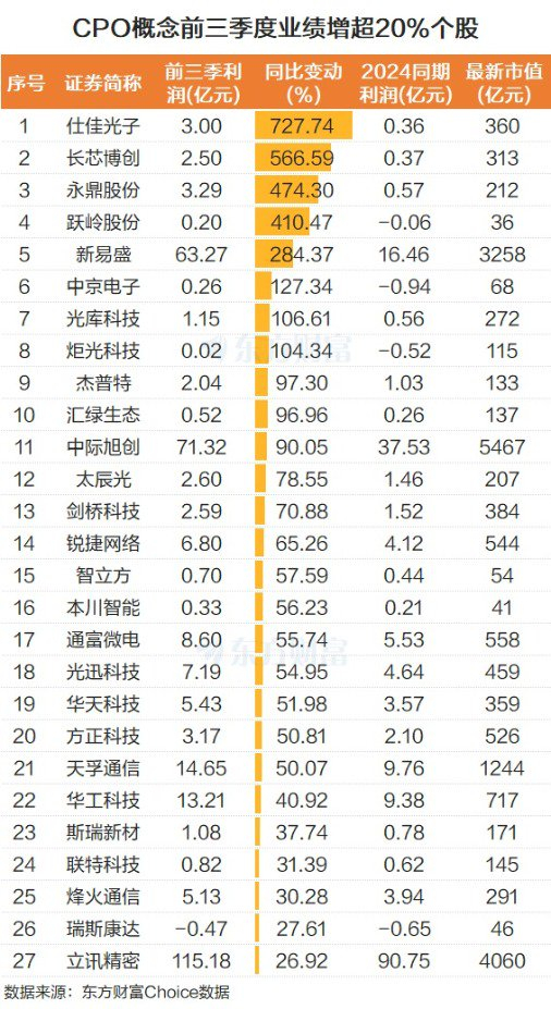 在AI快速发展带动算力需求激增的大背景下,CPO板块的业绩也迎来大幅增长。东方财富Choice数据显示,CPO板块2025年前三季度实现归母净利润420.98亿元,同比2024年前三季度的288.41亿元,同比大增45.97%。