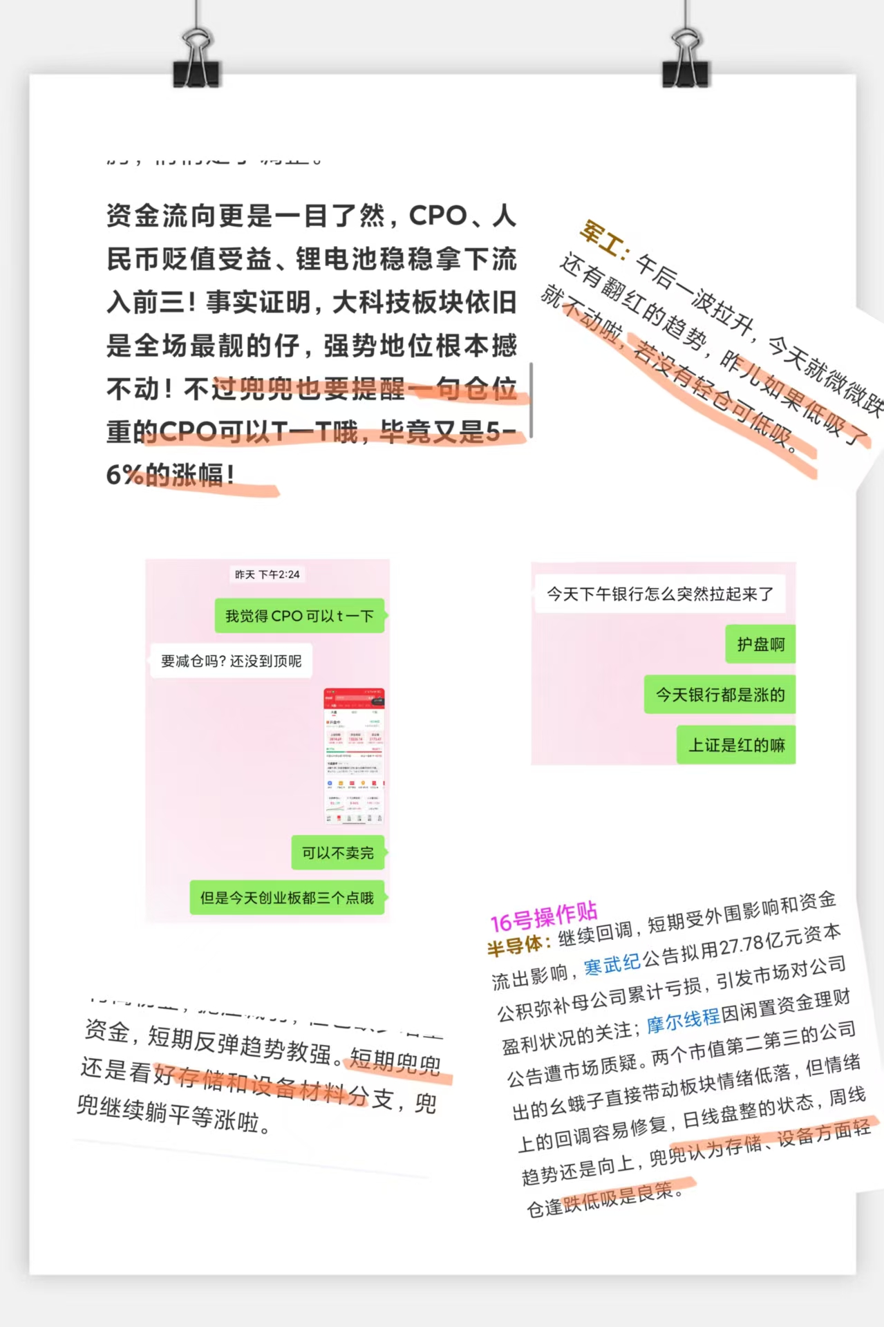 不过说到这,兜兜得凡尔赛一下!昨天在操作贴里明确提示可以T一下CPO,兜兜专门提醒了朋友,结果没跟上,今天正追着我拍大腿后悔呢!军工昨天提示低吸今儿也吃上肉了!看好的存储芯片大利好又出现!还是那句话:纪律大于天!想做高抛低吸的,跟着兜兜的操作贴节奏走准没错;想拿长线的,就不要把波动放在眼里,别让短期涨跌影响心情!
