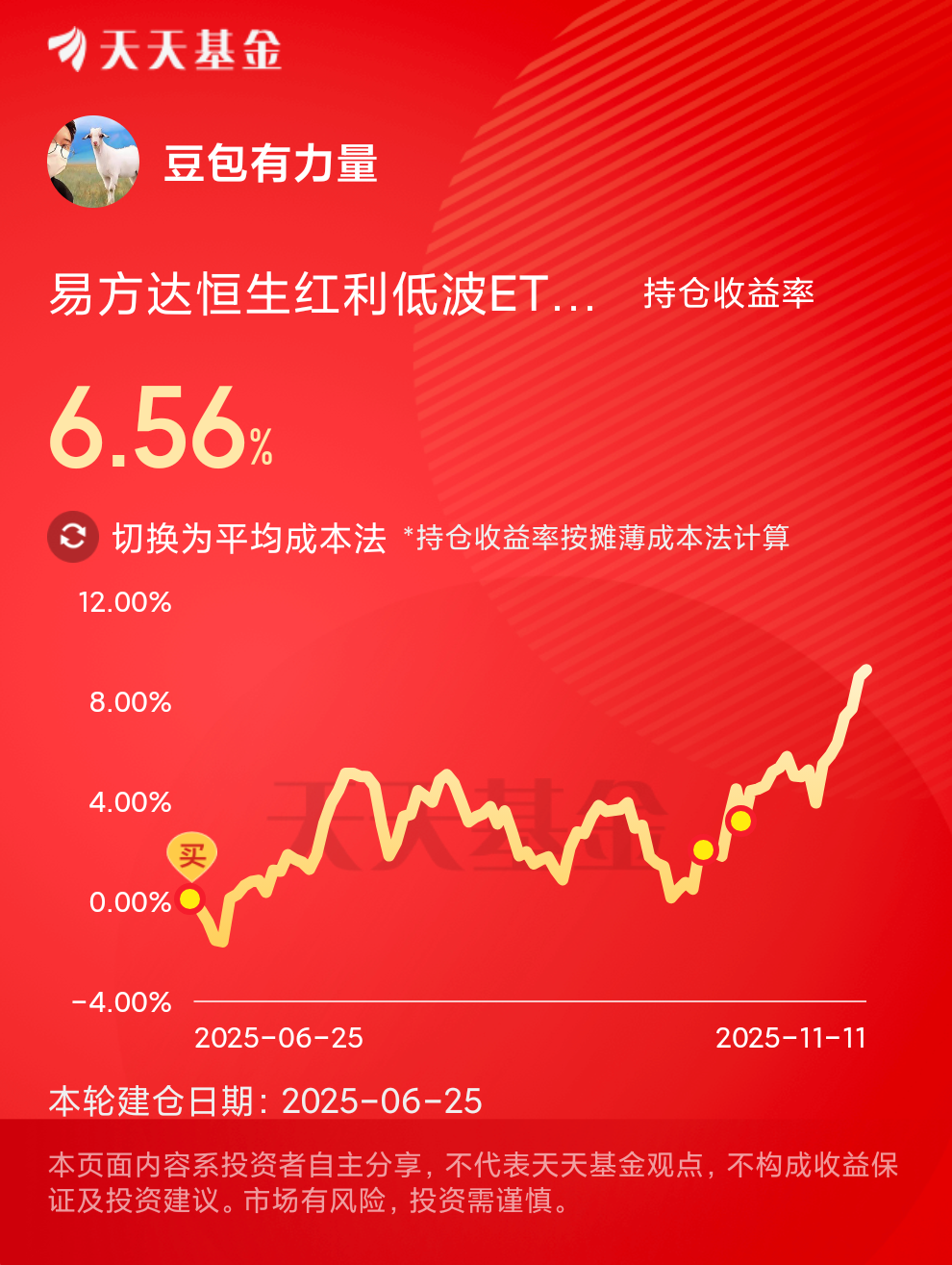 盘中恒生红利再涨0.6%左右,今天有望继续收涨,我来顺势增持一波,跟着主力调换节奏。