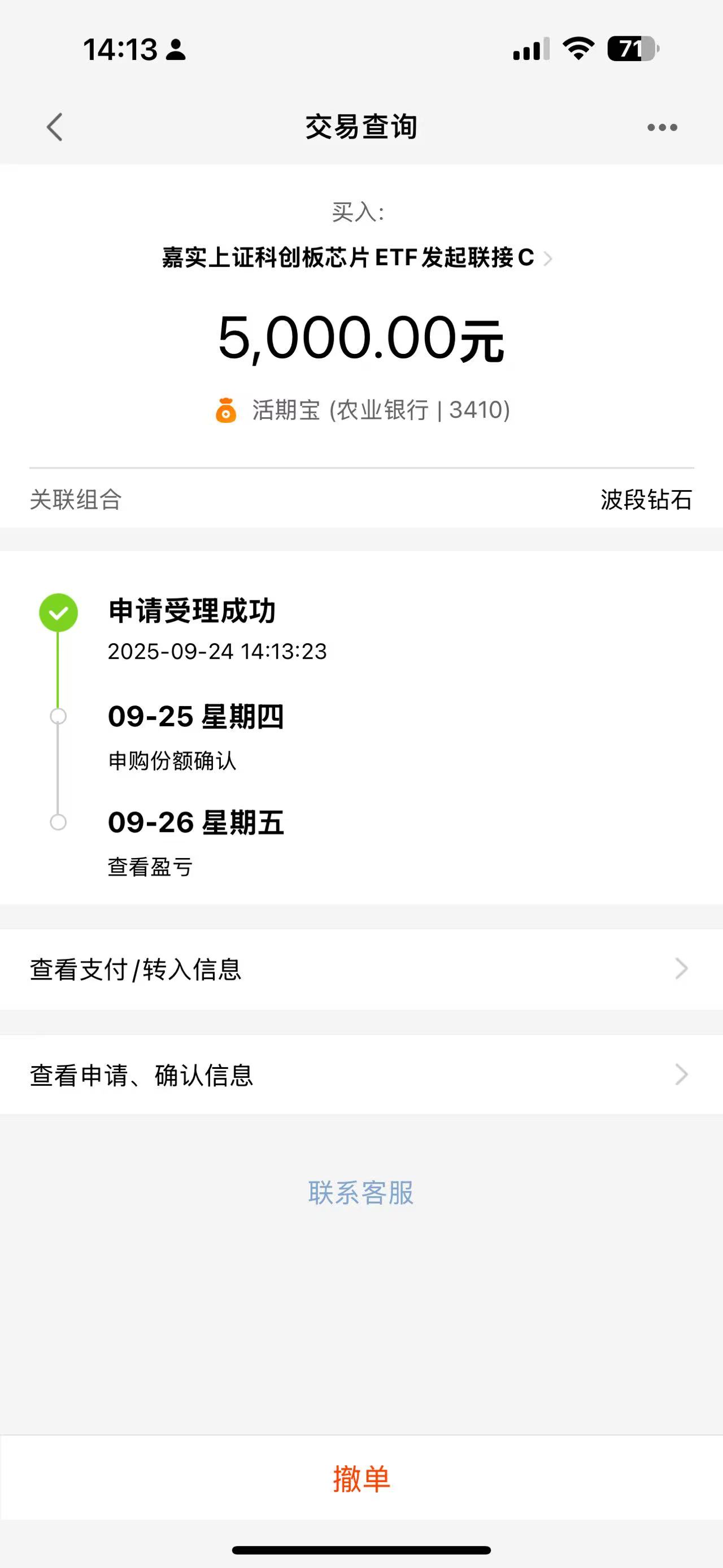 操作:忍不住追涨5000元$嘉实上证科创板芯片ETF发起联接C(OTCFUND|017470)$基金,这只基金跟踪科创芯片指数,是今日市场爆发力最强的指数,目前该指数涨幅近4%,日K线站在5日均线支撑上方,附图MACD金叉向上,多头趋势完好,短期行情有望再创新高。