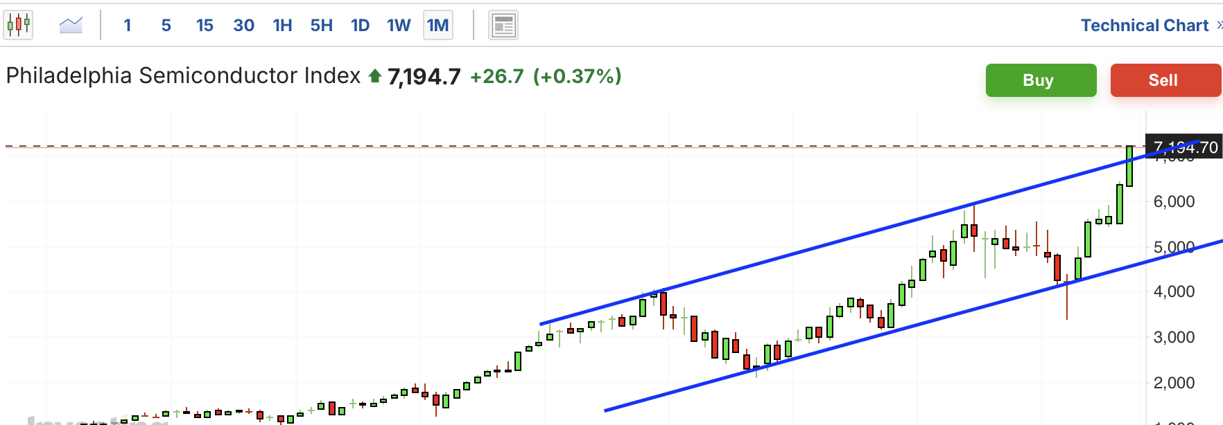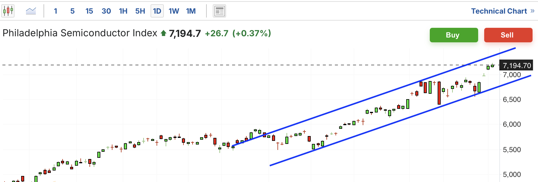 费城半导体近期进入上升通道,最近在短暂盘整后这两日大幅拉升,靠近通道压力位,目前仍为震荡上行趋势。从长期趋势看,它短期涨幅过大,已经形成超买。