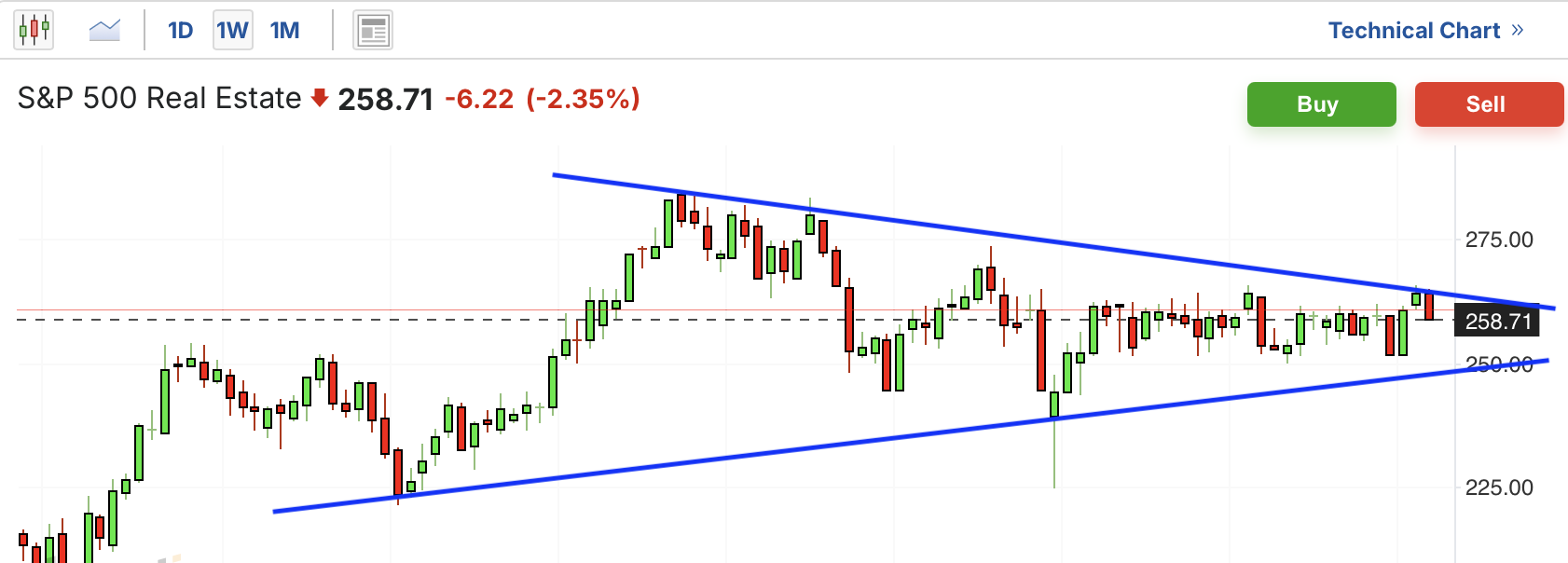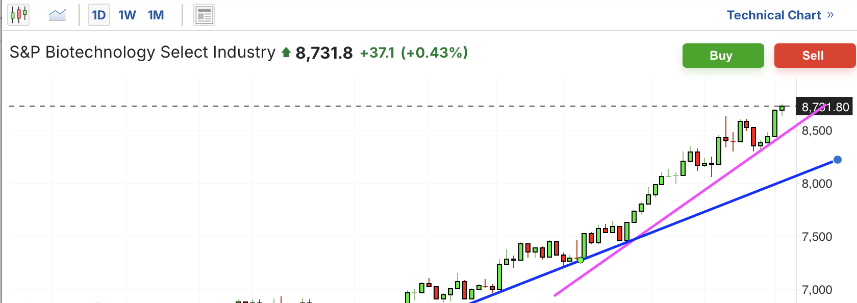 标普房地产近期形成对称三角形,这几日涨至通道压力位,如果成功突破,那么趋势反转向上,然而周二跌回。标普生物最近大幅飙升,短暂回撤后再次回升,继续强势上行中。