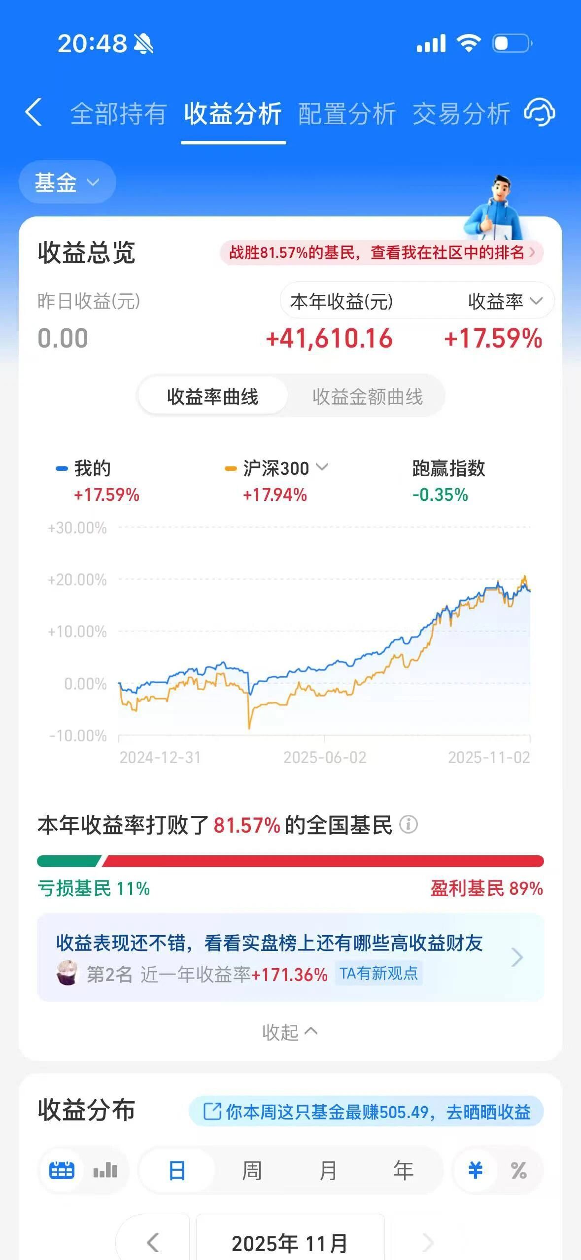昨天跟我初中历史老师聊了一下,问了下她最近支付宝的基金账户盈利情况和最新持仓情况。看了下,今年收益跑平沪深300,年内收益超4万,累计收益超6万。我对于这个收益,比较满意,可以打80分,下文会说具体原因。