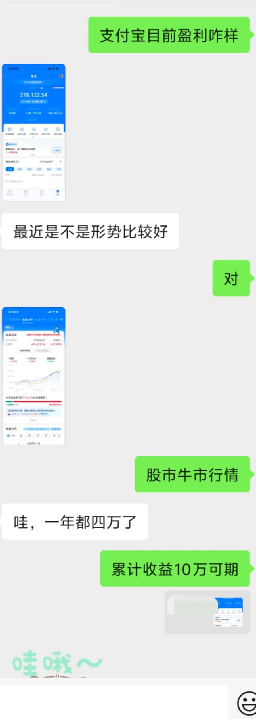我是大概19年左右,开始逐步帮我初中历史老师管理支付宝基金账户的。她基本是从0开始投入,之前从来没买过,金额是逐步累积上来的。因此,上一轮牛市(19-21年)其实她还没投入太多。中间22-24年,这三年也曾经比较煎熬,终于在今年再次迎来账户收益新高。