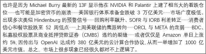 美股现在比较显眼的热点是“AI到底有没有泡沫”,最新的重磅事件是电影《大空头》的原型最近又开始当上大空头了。连带着还有好多衍生主题,包括映射到A股的,比如缺电,比如存储,等等。