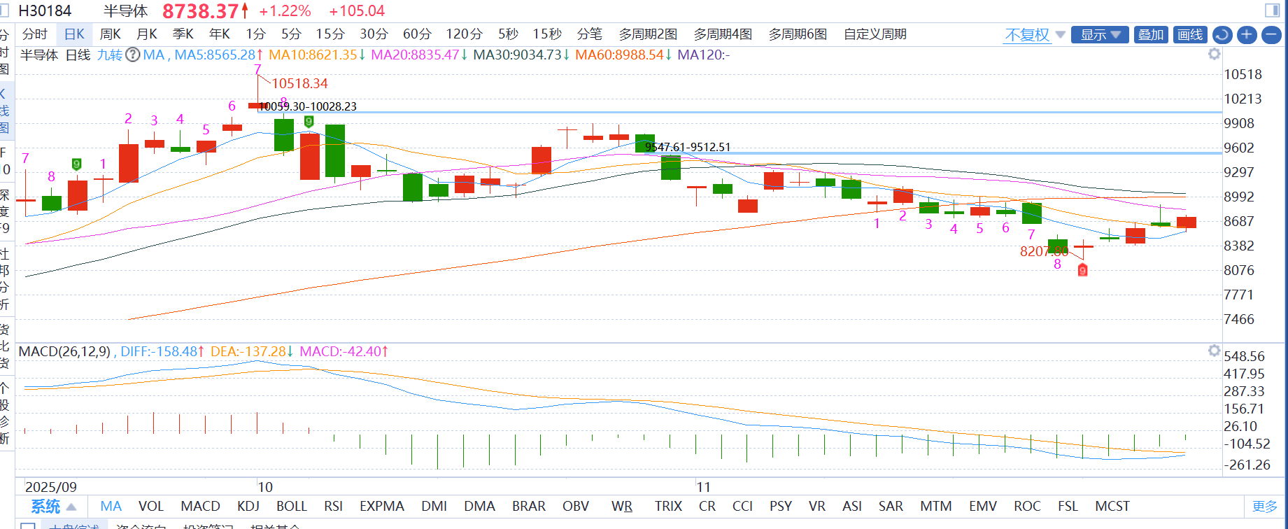 半导体:半导体板块今日活跃。周线底部抬升,20日均线支撑有效,麦爸继续持仓看涨。