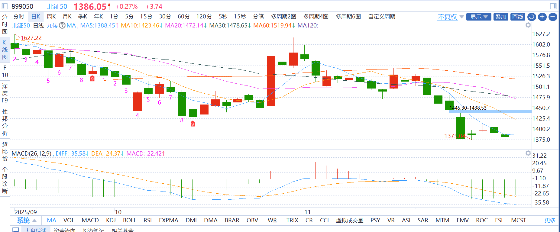 北证50:北证50指数虽今日小幅上涨0.35%,但指数均线还是空头排列,受制于均线压制,整体仍处于弱势,麦爸选择持仓观望。