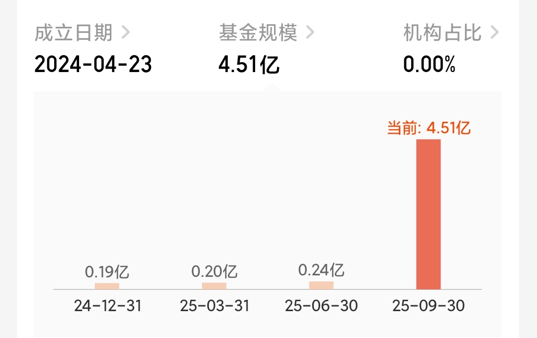 3.性价比高,市场认可度高。1.95的夏普比率,直接验证了较高的投资性价比,在25年的第3季度,规模从0.24亿暴增至4.5亿,足足涨了接近20倍,都说群众的眼睛是雪亮的,这一点在基金身上也能验证。