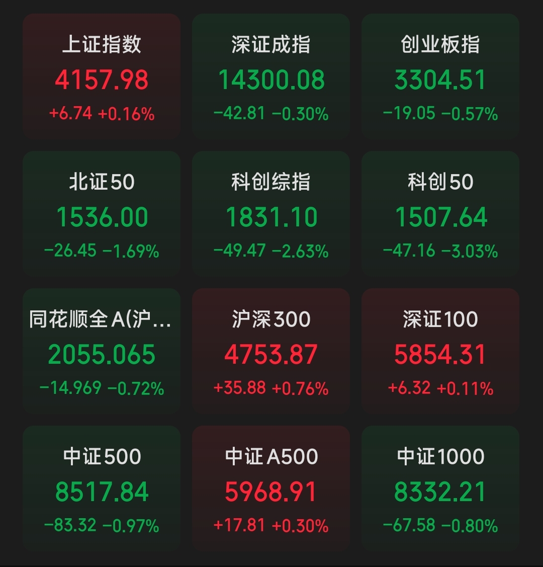 1、指数表现:4个指数红,8个指数绿。下图看,三大指数涨跌不一,沪深 300、中证 A500 为代表的大盘权重指数表现偏强。科创 50为代表的科创类指数则集体走弱,跌幅居前。市场呈现窄幅震荡格局。