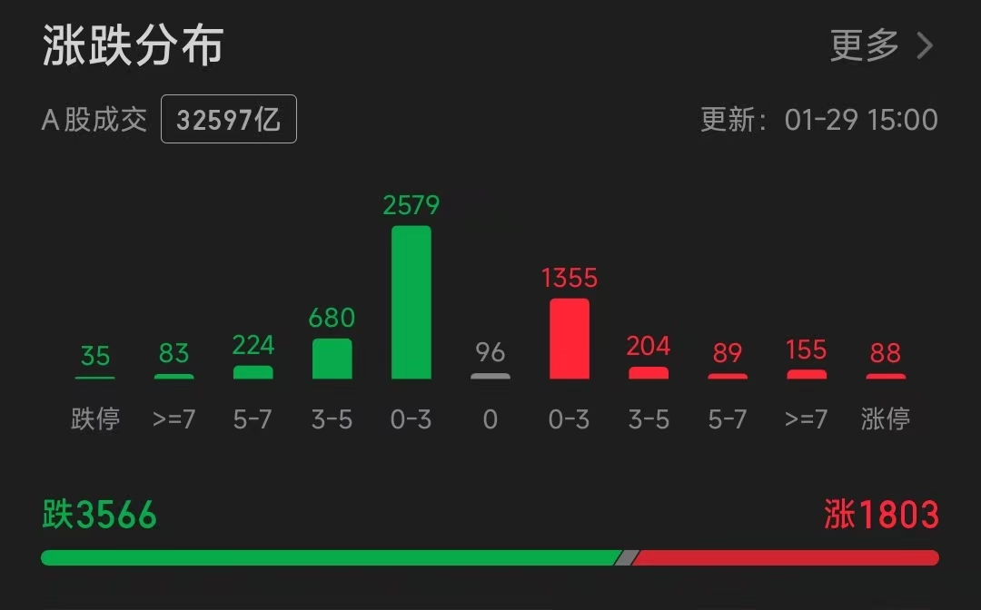 2、中位数表现:下跌0.94%。从市场股票涨跌分布来看,市场上涨1803家,下跌3566家,持股体验较差。