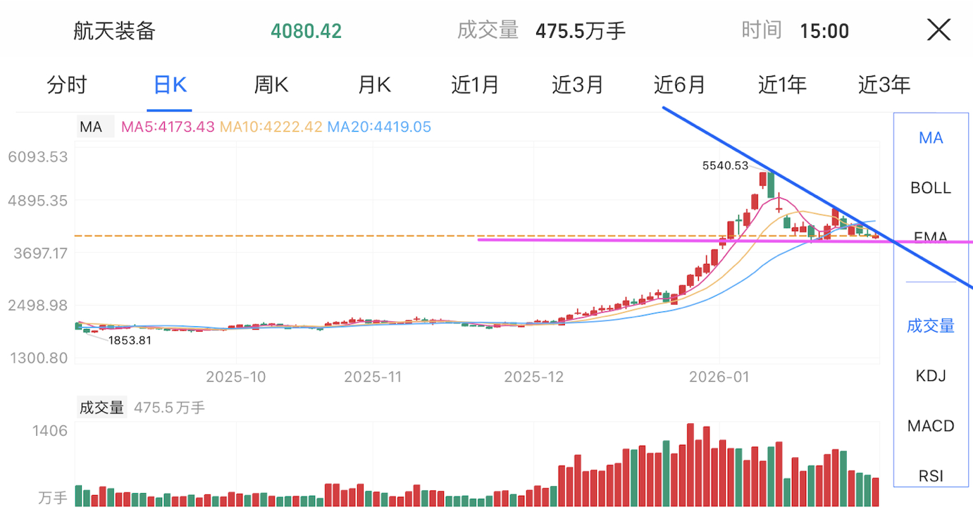 航天装备: 目前处于大涨后的调整阶段。K线已从布林带(BOLL)上轨跌落,并穿破了 5 日和 10 日均线。价格正靠近20 日均线关键支撑位。底部成交量较前期波峰有所萎缩。若能在 20 日线附近止跌震荡,则属于正常的上升趋势回踩;若放量下破,则需防范形态由强转弱。