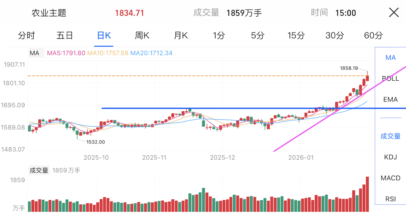 农业主题:近期走势强劲,呈现加速上涨态势。K线沿着布林带(BOLL)上轨快速攀升,突破了前期的震荡平台。量能温和放大配合股价上行,显示多头力量占据主导。由于短线涨幅较大且远离均线,需警惕技术性回踩 5 日均线的风险。