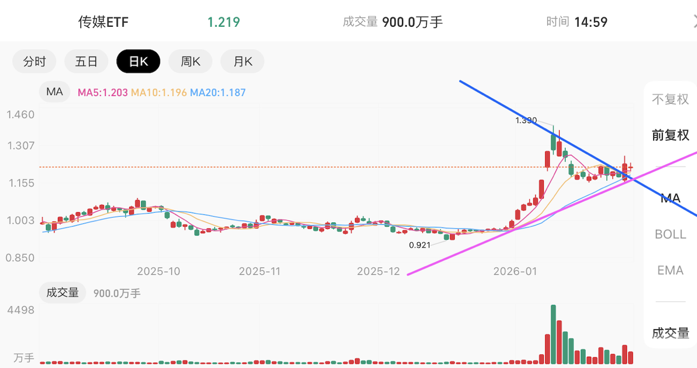 传媒(游戏):处于长期下行后的底部筑底阶段。K线重心已停止下移,开始在狭窄区间内横向波动,显示下跌动能基本枯竭。均线系统由向下发散转为走平并趋于粘合,这是明显的波段变盘前兆。若后续能出现温和放量的长阳线突破均线密集区,将确认底部反转形态。