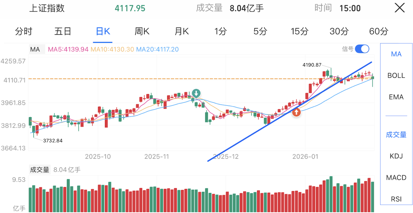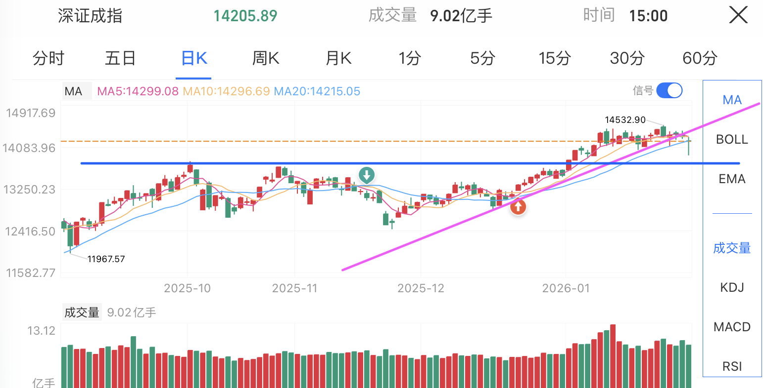 上证指数: 处于强势拉升后的高位盘整。价格沿布林带(BOLL)上轨运行,成交量配合良好,多头动能尚未衰竭。深证成指: 整体呈 45 度角缓步攀升,运行在所有均线上方。虽有平台套牢盘压力,但趋势保持良好。