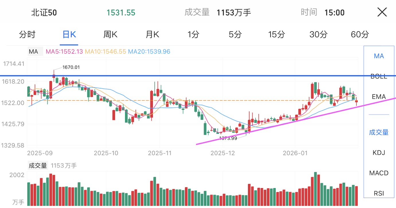 北证50:处于大幅领涨后的高位震荡整理期。K线近期在前期历史高点下方形成了横向波动的“平台区”。目前价格回踩至 20 日均线 附近,且均线斜率依然向上。上方前期历史高点附近存在抛压。若能守住 20 日支撑线并伴随量能回升,则有望挑战前期高点;反之,若放量跌破支撑位,则需防范调整级别扩大的风险。