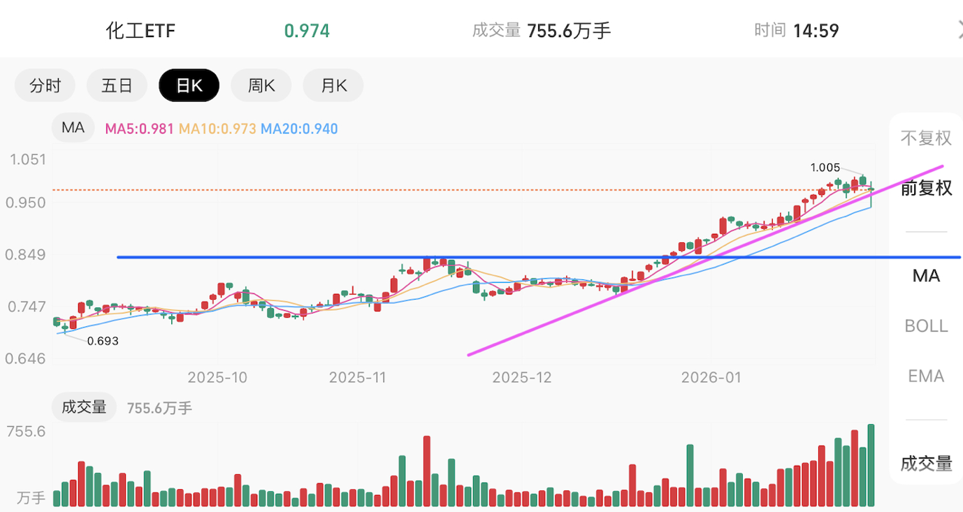 化工:整体处于缓步攀升阶段,K线沿着均线呈 45 度角向上移动,走势相对稳健。目前正处于触及前期高点压力位后的消化期。关键在于能否实现缩量回踩且不破均线。需注意若出现“放量滞涨”,短期回调压力将增大。