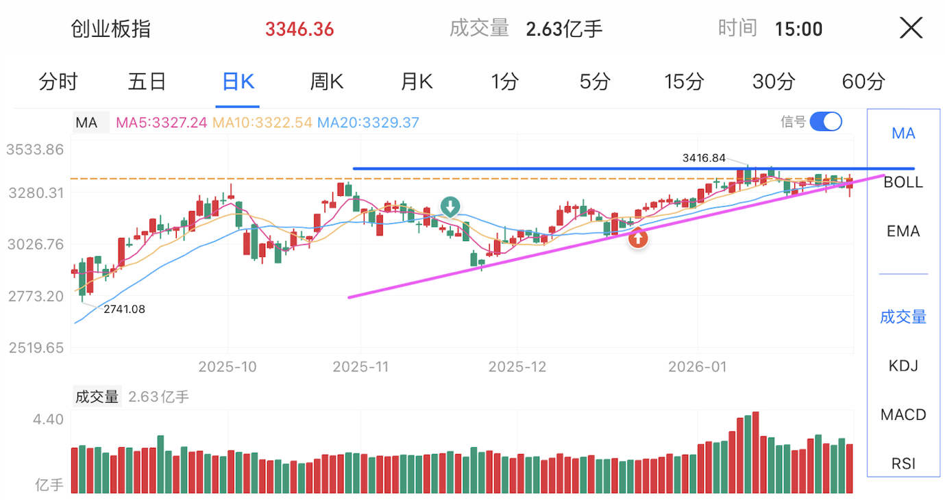 创业板指:高位横盘受阻,重心小幅回落至布林带中轨波动。追高意愿减弱,只要不跌破 20 日线,那么上行趋势未坏。