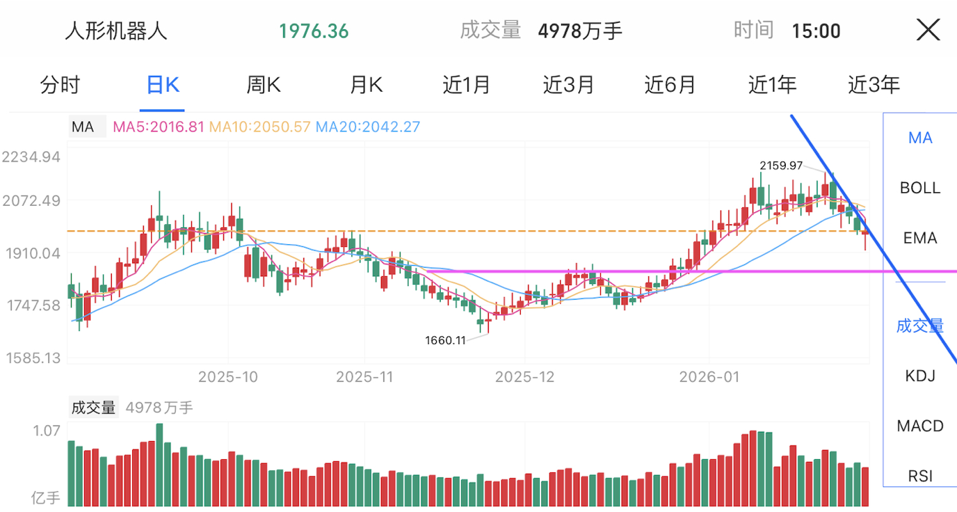 人形机器人:呈现明显的震荡下行格局,K线重心不断下移,已触及并尝试跌破布林带下轨。目前正面临 12 月底形成的低点平台 考验。均线系统已形成死叉并向下发散,短期多头反击力度微弱。目前尚缺乏明确的止跌企稳信号,需警惕“惯性探底”风险。