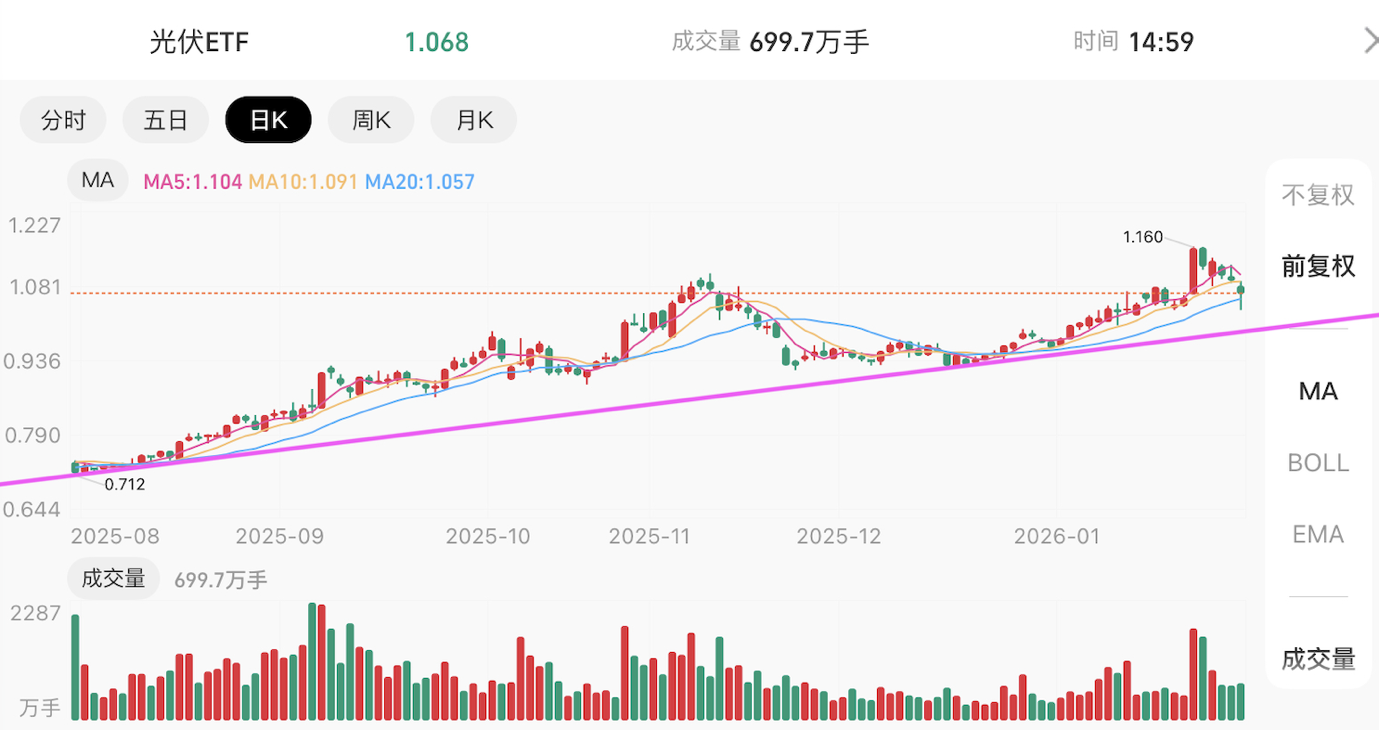 光伏:处于强势上涨后的获利回撤阶段。价格在触及上方强压力位后震荡下行,正试图在上升通道中轨附近寻找新平衡点。K线已回撤至短期均线下方。若能在 20 日均线附近缩量企稳并重回上升路径,则上升趋势未坏。若放量跌穿关键均线,则需防范中期调整周期的开启。