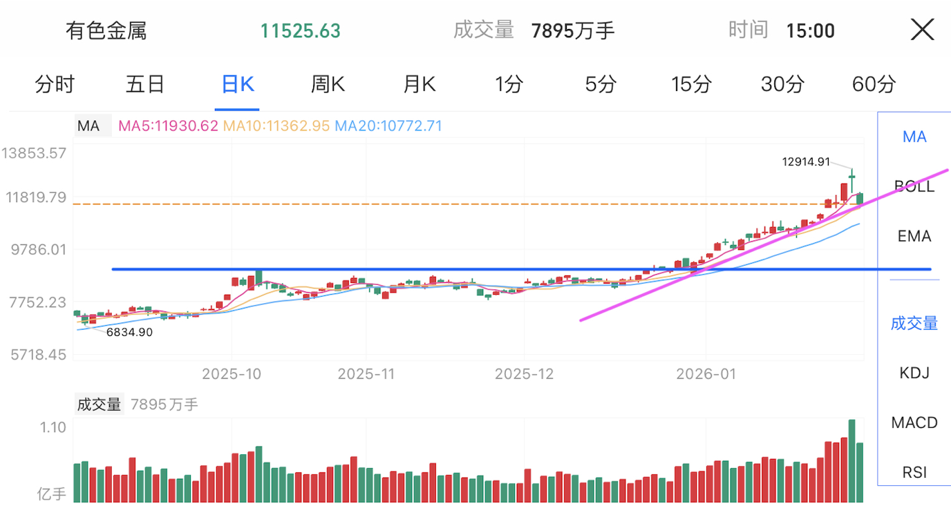 有色:在经历前期放量上攻并触及高位后,近期出现大幅下跌。K线已从布林带(BOLL)上轨快速向下回落。若能在当前位置止跌,则属于上升趋势中的正常震荡;若跌破均线且无量能支撑,则需警惕短期趋势转弱。此次下跌伴随着成交量的放大,显示高位获利盘抛压沉重。