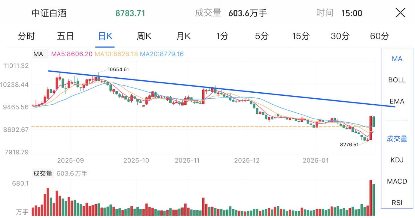 白酒:目前运行在标准的下降楔形通道之中,整体重心不断下移。价格正处于接近前期低点的支撑位。均线仍呈现空头排列且向下发散,对反弹构成层层压力。虽然近期出现了大幅上涨且放量的反弹,但整体下降趋势未改。需持续关注成交量是否能保持活跃以及市场信心的修复,以判断这是否为有效的筑底信号。