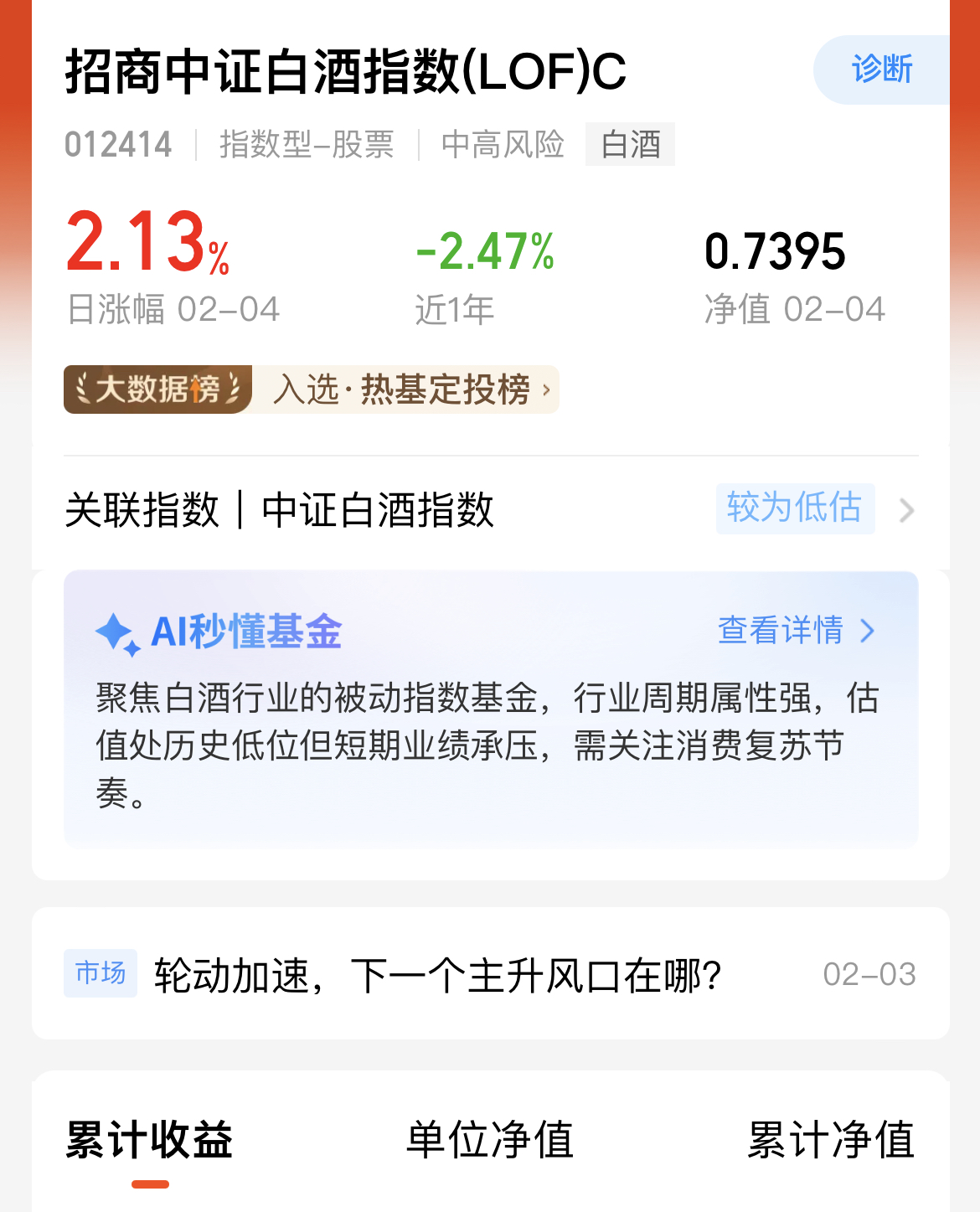 春节消费旺季到来,白酒需求回暖,板块迎来估值修复。最近$招商中证白酒指数(LOF)C(OTCFUND|012414)$表现不错,昨天该基金上涨2.13%,近一周涨幅9.83%,走势强劲。短期看春节旺季催化,中长期看业绩稳定,趁着行情不错,我也打算提前埋伏起来,坐等后期吃肉啦!