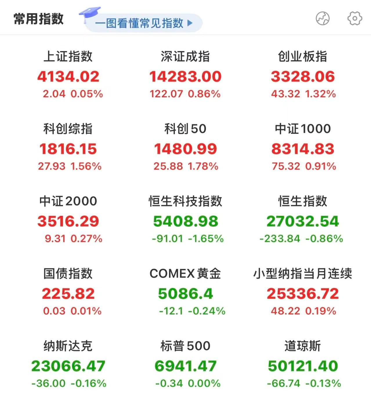 A股三大指数今日走势分化,沪指震荡整理微涨,深证成指和创业板指走势较强,沪深京三市成交额2.16万亿,较昨日有所放量;港股走弱,恒指恒科双双收跌;债市持续回暖,利率债晴天,信用债多云;黄金持续高位震荡。