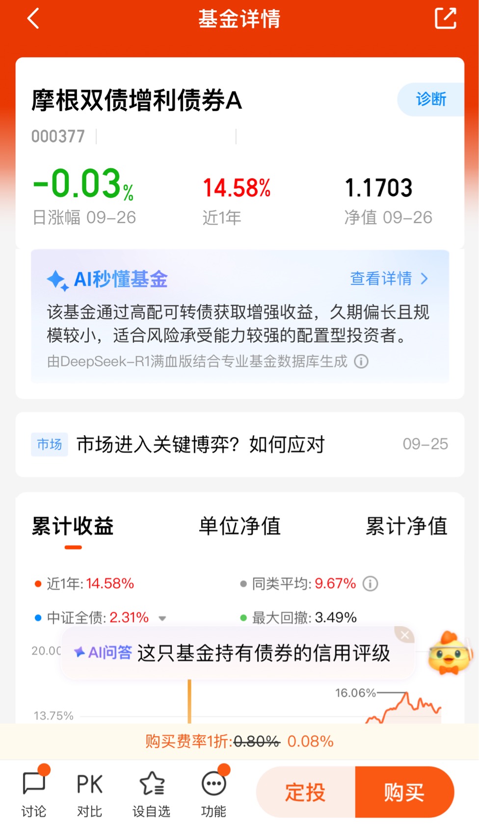 从历史数据来看,二级债基的风险收益特征介于纯债基金与混合型基金之间,既能降低波动,又能把握权益市场的结构性机会。例如,在2022年股市剧烈调整期间,沪深300指数全年下跌超过21%,而同期二级债基指数仅回撤3%,展现出较强的抗跌能力。摩根双债增利债券基金作为一只“固收+”产品,其风险控制能力同样值得期待。