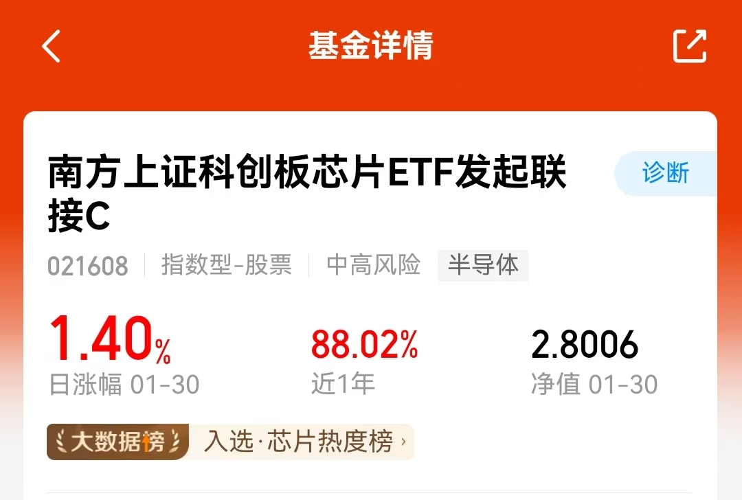趁着市场调整,我今天又买了些$南方上证科创板芯片ETF发起联接A$(021607)。我始终认为芯片是值得关注的重要方向,短期的市场波动不会改变长期的产业趋势。这只基金近一个月获得15%的回报,半年时间涨幅达到了65%,业绩表现十分出色,并刚刚实现了净值新高。选择指数基金的方式参与,对我来说是一种更简单直接跟进行业的方式。#暖阳创作计划#