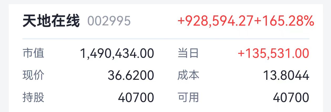 各位朋友们下午好呀,我是去年收益率100%+的短线选手小元。很多小伙伴问小元去年收益怎么这么漂亮,你别说去年,今年我都又起飞了!所以实力在线,关注一段时间你就知道了!今日A股延续弱势格局,一路低开低走,目前保持在4060点附近,两市预计成交2.27w亿,较上个交易日缩量2300亿,上涨近1500支个股,42家涨停,其中就有小元一直重仓持有的天地在线!就问你这独到的眼光绝不绝!场内我一直给大家强调我看好AI应用,最近的势头也没有辜负小元,场外小元依然重仓AI应用,只是目前行情还没有起色,但是小元既然能够捕捉到场内这么大的涨幅,场外也不会错,只是时间问题罢了!话不多说,关注小元,带你抓住行情机会,把握住这波吃肉的机会。