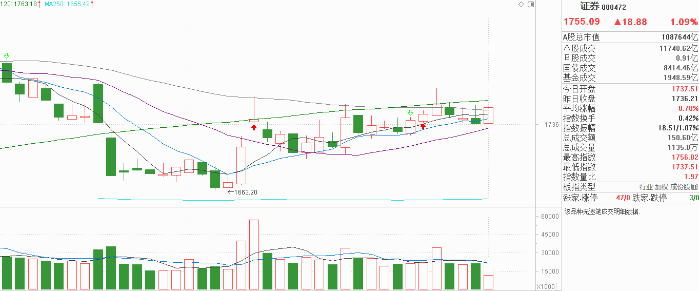 证券节前小阳反弹至60天线上方就冲高回落,最终倒跌小阴失守10天线,说白了就是此前震荡行情的延续,震荡区间是20天线与半年线,只要证券在这个区间内波动,我觉得箱顶与箱底还是很明显的。今天20天线继续上行,证券在10天线下方小阳反弹,但未有修复节前上影线的动力,依然可以看成是无序震荡。我们可以看到,这些均线已经粘合在一起,如果还在这个区间内波动,价差空间非常少挺难掌握的,还不如看到主力异动后才跟随,比如中阳反弹就看涨,中阴调整就看跌,现在的走势我认为是无法确认方向,说不定明天又会窄幅震荡,小阳小阴就没啥短线吸引力了。