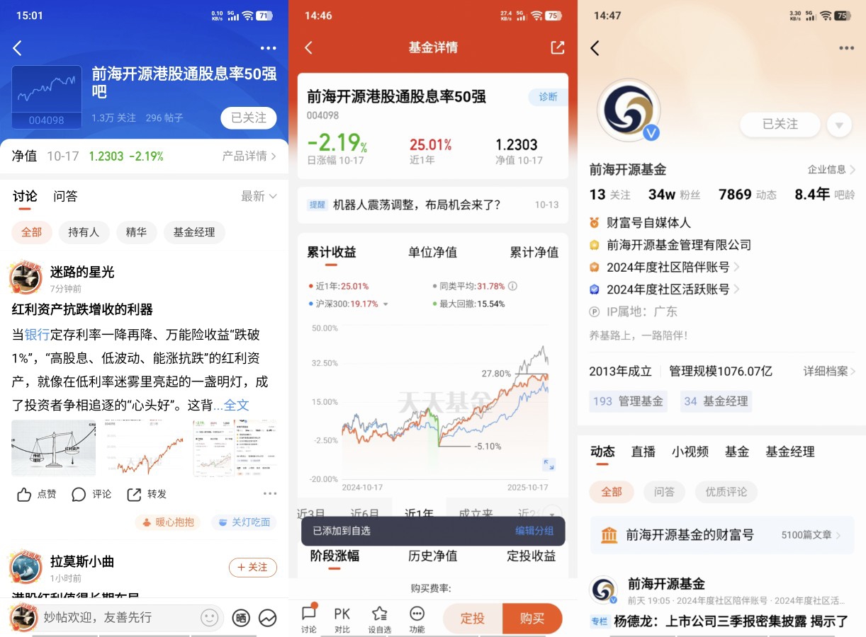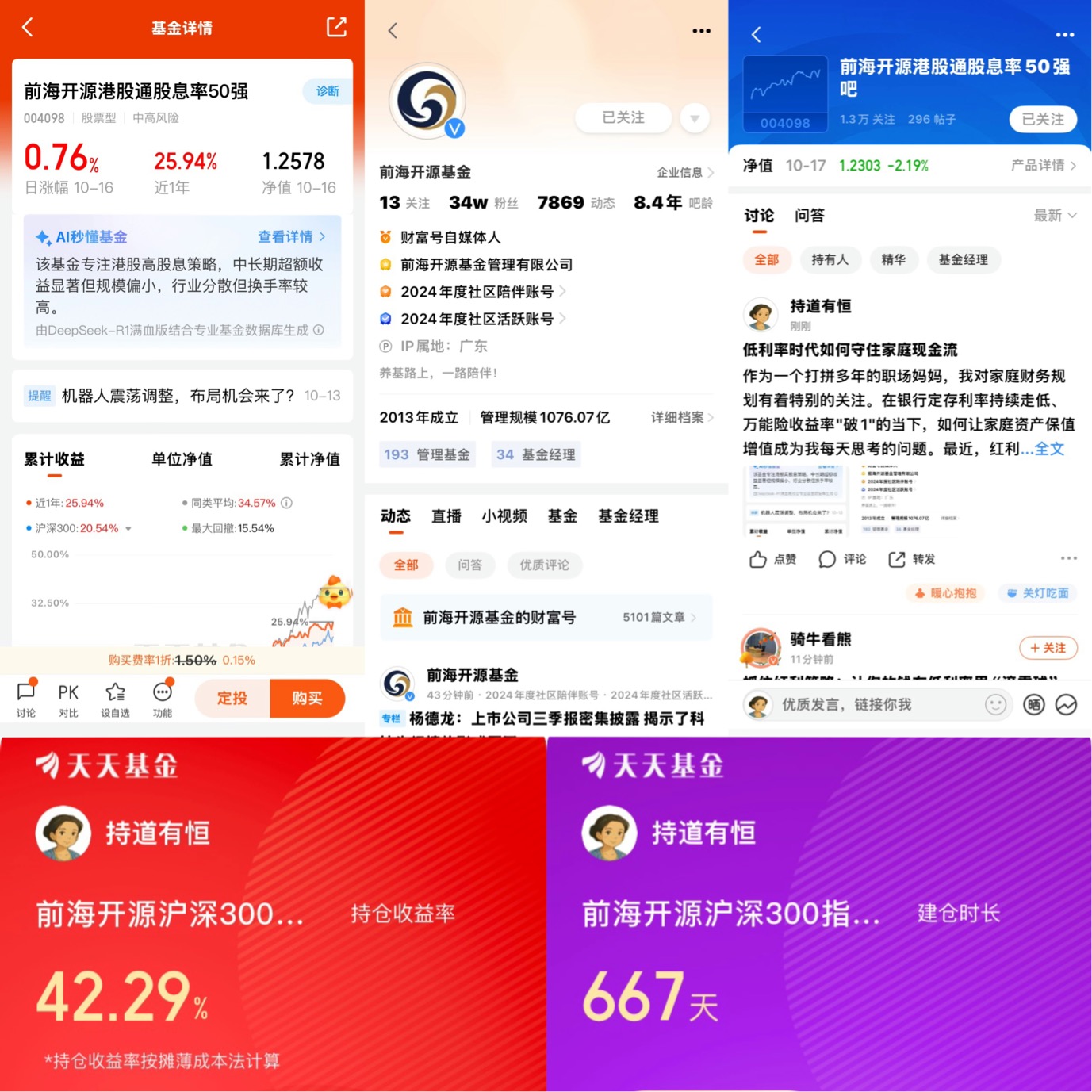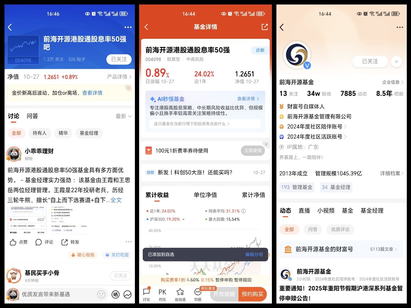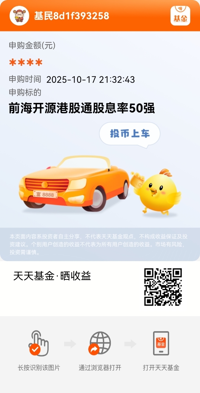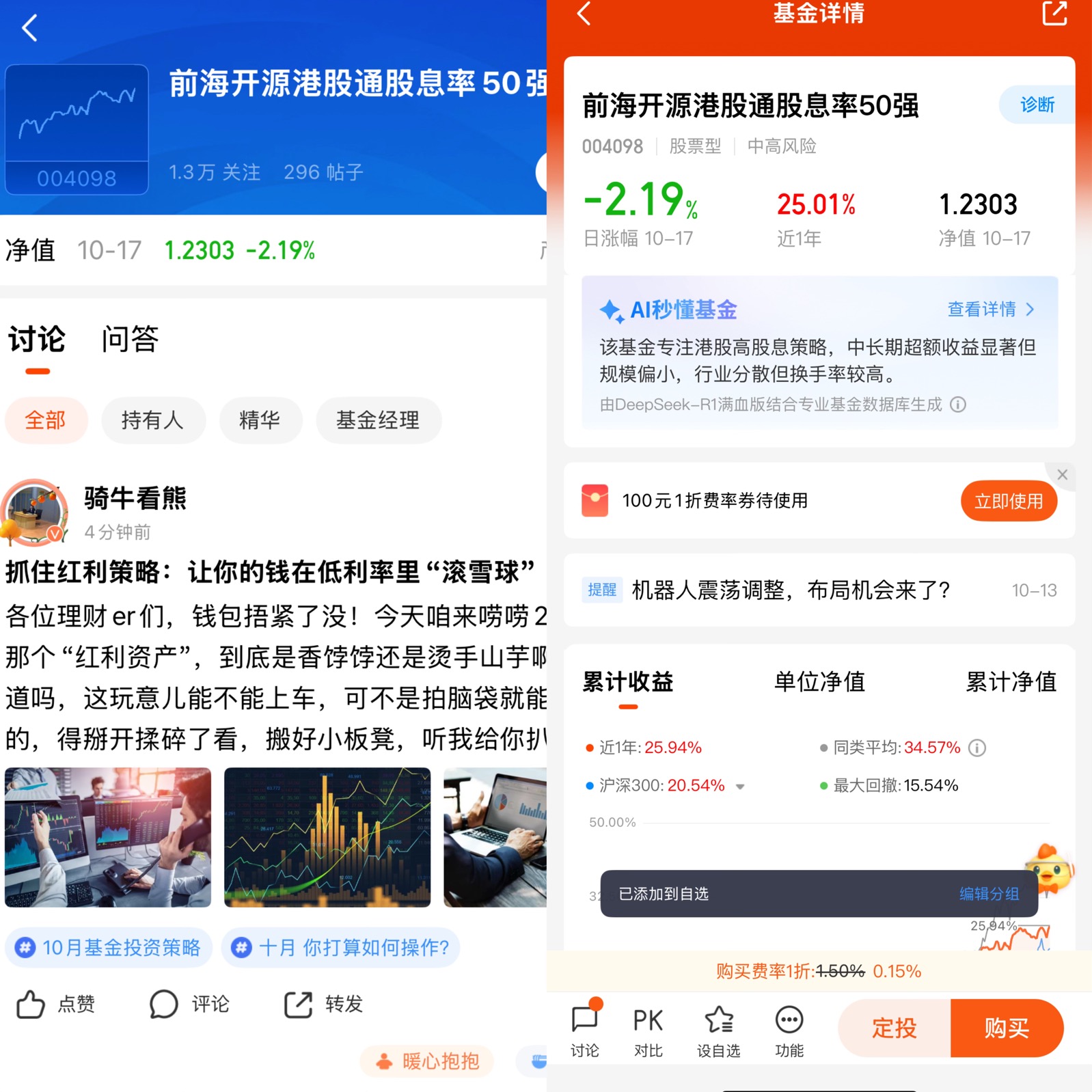第二步:进入$前海开源港股通股息率50强(OTCFUND|004098)$的基金吧,晒出加自选截图,并聊聊你对红利资产的观点,或者对该基金各方面的点评~(发布持有体验仅限于在活动发布前已持有产品的用户)