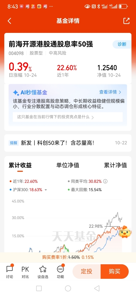 这只基金一年涨幅超过百分之二十,表现非常不错。一般选择指数基金的原则,只要满足基金规模大、成立年限长且管理费率足够低即可,而$前海开源港股通股息率50强$ 正好满足了上述要求,可用日常零散资金长期定投,也可以在基金回调时选择一笔购入,长期持有,一定会有好的回报。