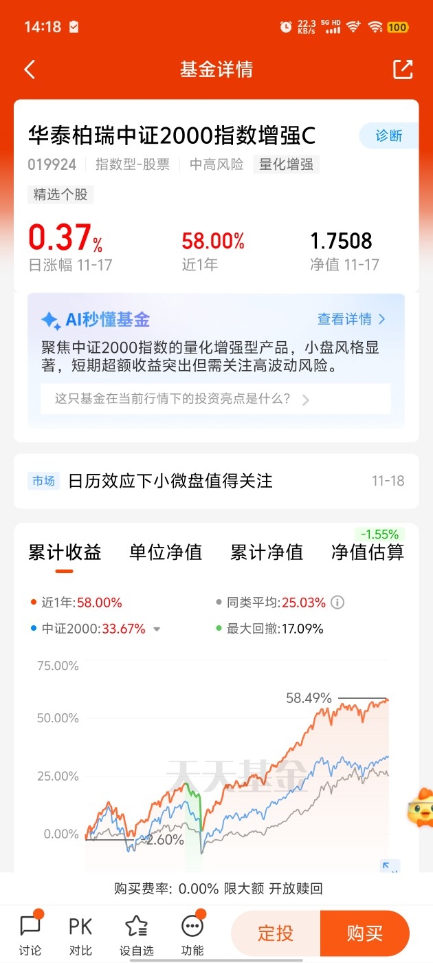 今天A股整体波动不大,但细分板块分化明显,前期热门的大板块没什么动静,中证2000指数带动的中小盘股却悄悄发力,资金持续流入。这种时候选对基金很重要,华泰柏瑞的量化超额能力真不是吹的,近一年A类超额收益在同类里排第一,能精准捕捉中小盘股的机会,还能通过量化模型多赚一笔,C类门槛低,几百块就能参与,不用担惊受怕踩雷,稳稳跟着喝口汤就行。#今年买基金赚了多少钱?# $华泰柏瑞中证2000指数增强C$