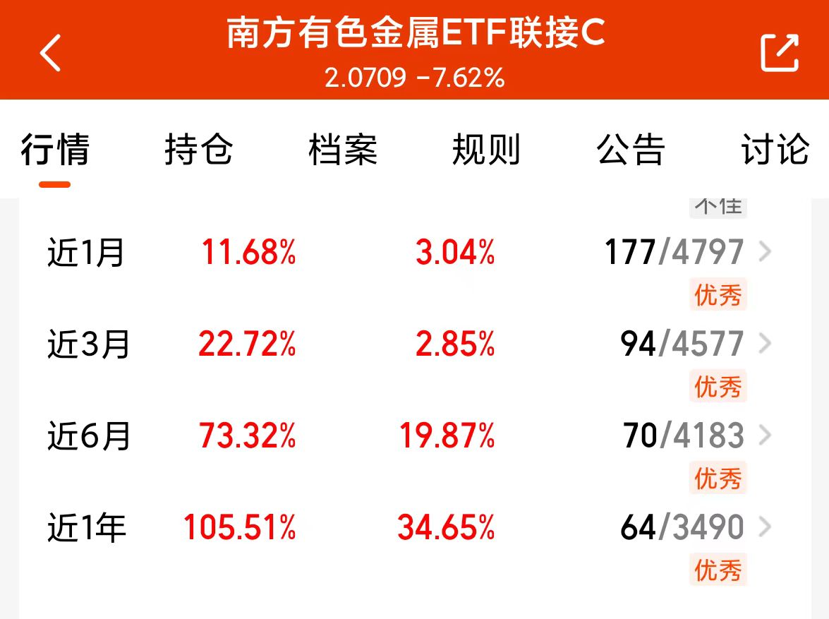 (1)今日有色金属随黄金快速企稳反弹,这波右侧机会自然要牢牢抓住!姚姚果断加仓1000元$南方有色金属ETF联接C(OTCFUND|004433)$,趁势拉低持仓成本。尽管近期板块出现大回撤,但回看近一年、近六个月走势,这只基的涨幅均稳居同类平均前列,基本面底气十足,坚定做多毫无顾虑。