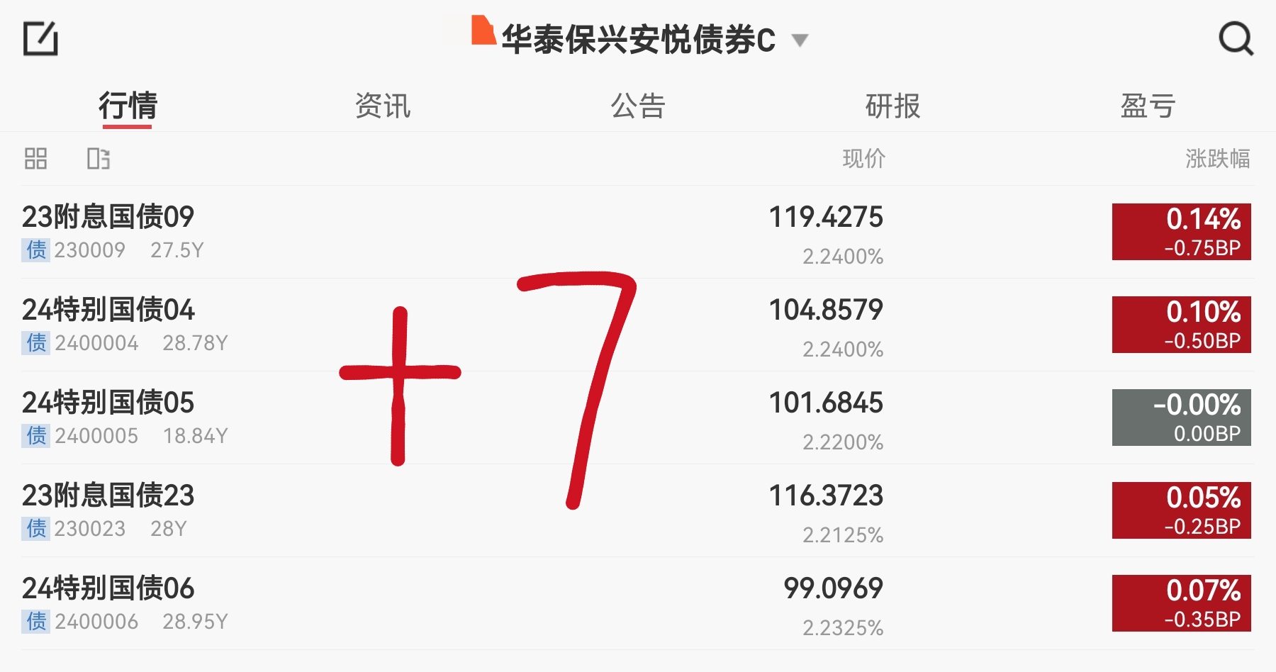 太不容易了,终于看到利率债拉升了,目前长端债券大部分已经翻红了,华泰保兴安悦债券C的估值也有绿转红,目前收7个蛋5。